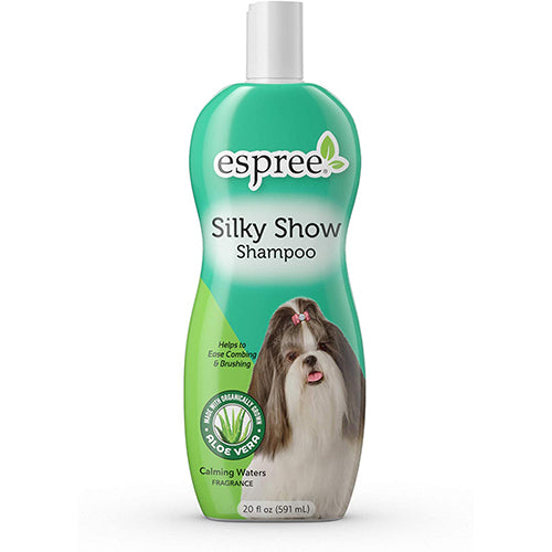 Espree Silky Show Shampoo for dogs 591 ml This luxurious shampoo will turn your pet into a show ring champion! Improves Texture & Shine Conditions damaged coats Made with 100% Organically Grown Aloe Vera Made in the USA