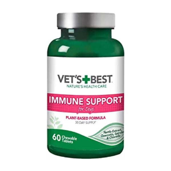 Vet's Best Immune Support Dog Chewable tablets 60(tablets) SUPPORTS OVERALL HEALTH - Immune support supplement is a valuable source of vitamins and minerals that can help with your dogs general wellbeing and promote a healthy and active immune system RELIEF - Vet's Best immune support Supplement can help dogs with seasonal allergy discomfort by supporting proper skin moisture and helping to maintain normal histamine levels ALL NATURAL - No artificial colours, preservatives or flavours INGREDIENTS - Using plant based and other premium ingredients that help support the immune system include Quercetin, MSM and nettle extract TASTY DOG SUPPLEMENT - Dogs love our chewable formula and each bottle contains 60 tablets