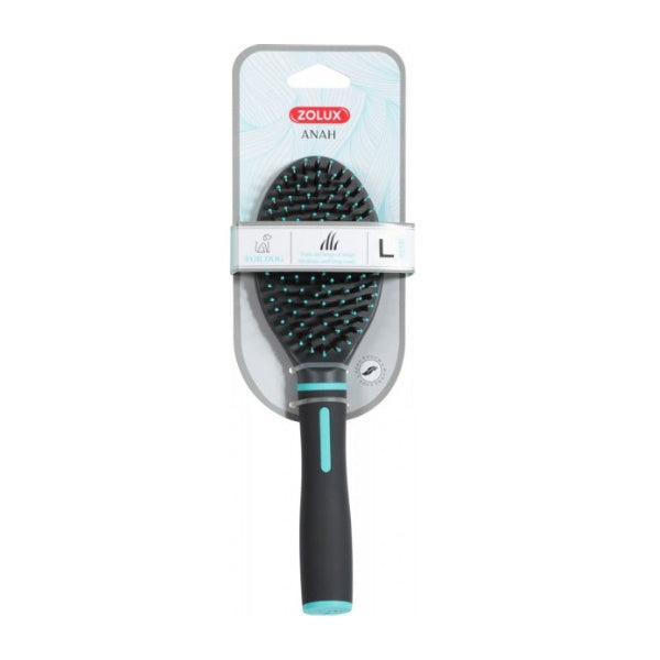 Zolux BI-MATERIAL BRUSH Bi-material brush for dogs from the ANAH range from Zolux. Size L, Width 6.7 x depth 10.5 cm x length 23.5 cm thickness of the brush 3 cm for medium and long hair. Durable and robust ABS plastic, soft to the touch, good grip thanks to the non-slip stitch.